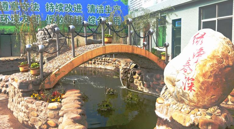 最吸引眼球的莫過(guò)于車(chē)間辦公室前面的小花池了!形色各異的石頭砌就的圍堰獨(dú)具特色,碧綠的池水上架著一座微型拱橋,廢舊物料制作的銀白色立柱、圓球形套環(huán)與黑褐色鐵鏈組成的安全護(hù)欄,一下子把小橋裝扮得韻味十足。兩塊形態(tài)獨(dú)特的文化石屹立在池水中,一塊寫(xiě)著“清風(fēng)池”,另一塊寫(xiě)著“綠凈春深”;水面上的噴頭如一朵小蓮花正吐露著銀色的水花;難得的暖陽(yáng)灑向水面,紅色、黃色、銀白色的小金魚(yú)聞聲成群結(jié)隊(duì)地向我們游來(lái),不時(shí)激起一圈圈漣漪。“清風(fēng)池”上微風(fēng)徐來(lái),“綠凈春深”意境悠遠(yuǎn),怎一個(gè)美字了得?不由得讓人駐足觀望,仿佛自己走進(jìn)了鬧市中公園一角。