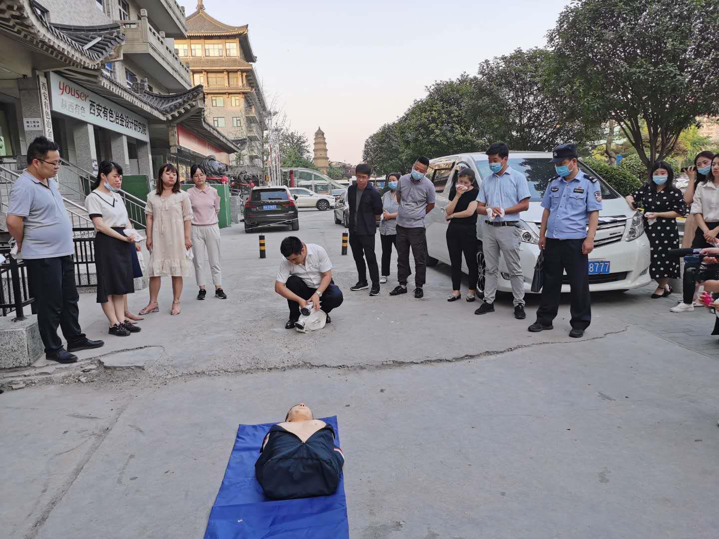 演練結束后,碑林區(qū)南大街派出所民警對大家進行了現(xiàn)場指導,組織員工開展規(guī)范使用滅火器和消防水帶拋灑及收帶工作培訓,并普及了火災中的急救知識。