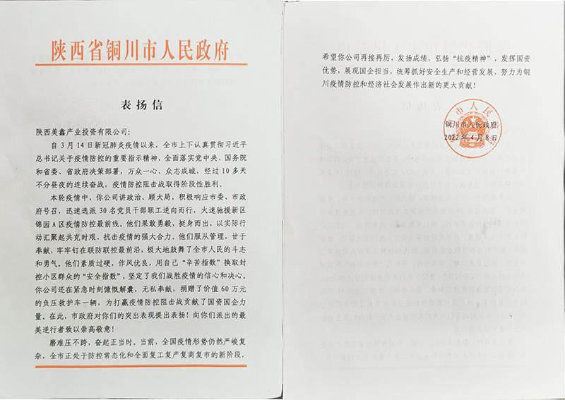4月上旬,銅川市人民政府向陜西美鑫公司發(fā)來一封《表揚(yáng)信》,對(duì)該公司積極參與銅川市3.14疫情防控工作付出的努力和做出的貢獻(xiàn)表示高度的贊揚(yáng),對(duì)主動(dòng)擔(dān)當(dāng)、勇于作為,防疫情、穩(wěn)生產(chǎn)取得的成績給予充分肯定。