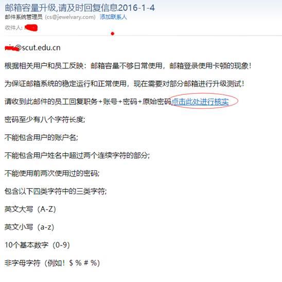 釣魚(yú)郵件的主要特點(diǎn):以某管理機(jī)構(gòu)的身份或虛構(gòu)人員,或使用偽造郵件地址,使用所謂正式通知的語(yǔ)氣,內(nèi)容涉及到賬號(hào)和密碼等敏感信息,可能帶有鏈接地址或附件。