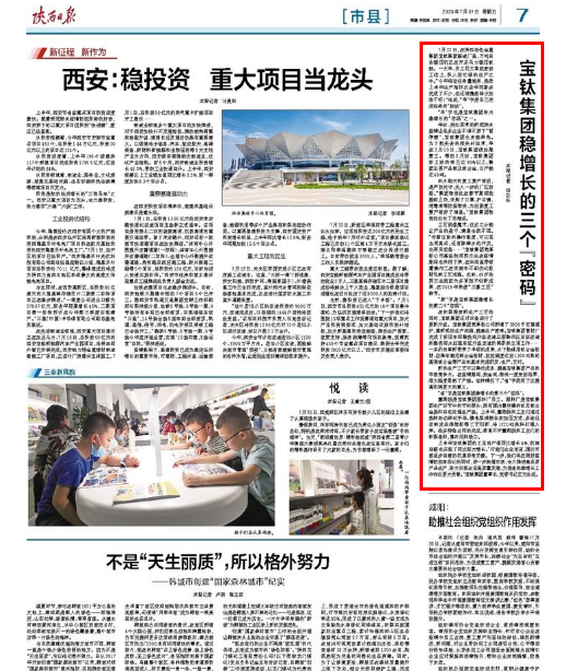 上半年寶鈦集團的工業(yè)總產(chǎn)值同比增長4%,利潤總額也實現(xiàn)了同比較大增長。“對我們企業(yè)而言,國內(nèi)市場逐步回暖的機遇非常關(guān)鍵。下一步,我們將在做好疫情防控常態(tài)化的同時,進一步拓展市場,全力推進高品質(zhì)產(chǎn)品生產(chǎn),努力實現(xiàn)企業(yè)高質(zhì)量發(fā)展,為我省的穩(wěn)增長工作作出更大貢獻?!睂氣伡瘓F董事長、黨委書記王文生說。