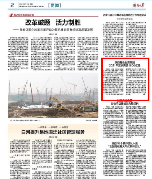 2021年,陜西有色金屬集團(tuán)安排固投項(xiàng)目154項(xiàng),計(jì)劃投資34.07億元,實(shí)際完成41.71億元。集團(tuán)下屬的寶鈦集團(tuán)高品質(zhì)鈦鐵生產(chǎn)線等3個(gè)擴(kuò)能項(xiàng)目投料運(yùn)行,榆林新材料集團(tuán)杭來灣煤礦新增200萬噸產(chǎn)能獲批,陜西美鑫冶坪煤礦正式生產(chǎn)。