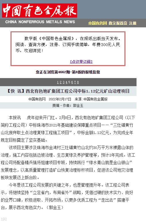 本報(bào)訊 虎年迎來(lái)開(kāi)門(mén)紅。2月8日,西北有色地礦集團(tuán)工程公司(以下簡(jiǎn)稱工程公司)中標(biāo)珠海市2021年基礎(chǔ)建設(shè)保障重點(diǎn)項(xiàng)目——“三灶鎮(zhèn)黃竹山北廢棄取土點(diǎn)治理復(fù)綠工程施工項(xiàng)目”,中標(biāo)金額1.12億元,為完成全年既定目標(biāo)奠定了堅(jiān)實(shí)基礎(chǔ)。