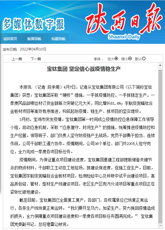 截至目前,寶鈦集團(tuán)已全面復(fù)工復(fù)產(chǎn),各部門(mén)、各權(quán)屬單位已恢復(fù)正常運(yùn)行,各條生產(chǎn)線恢復(fù)正常運(yùn)轉(zhuǎn)?!拔覀円_(kāi)足馬力,加緊生產(chǎn),努力挽回疫情造成的損失,全力保障重點(diǎn)項(xiàng)目建設(shè)進(jìn)度和一季度各項(xiàng)目標(biāo)任務(wù)圓滿(mǎn)完成?!?寶鈦集團(tuán)黨委副書(shū)記、總經(jīng)理雷讓岐說(shuō)。
