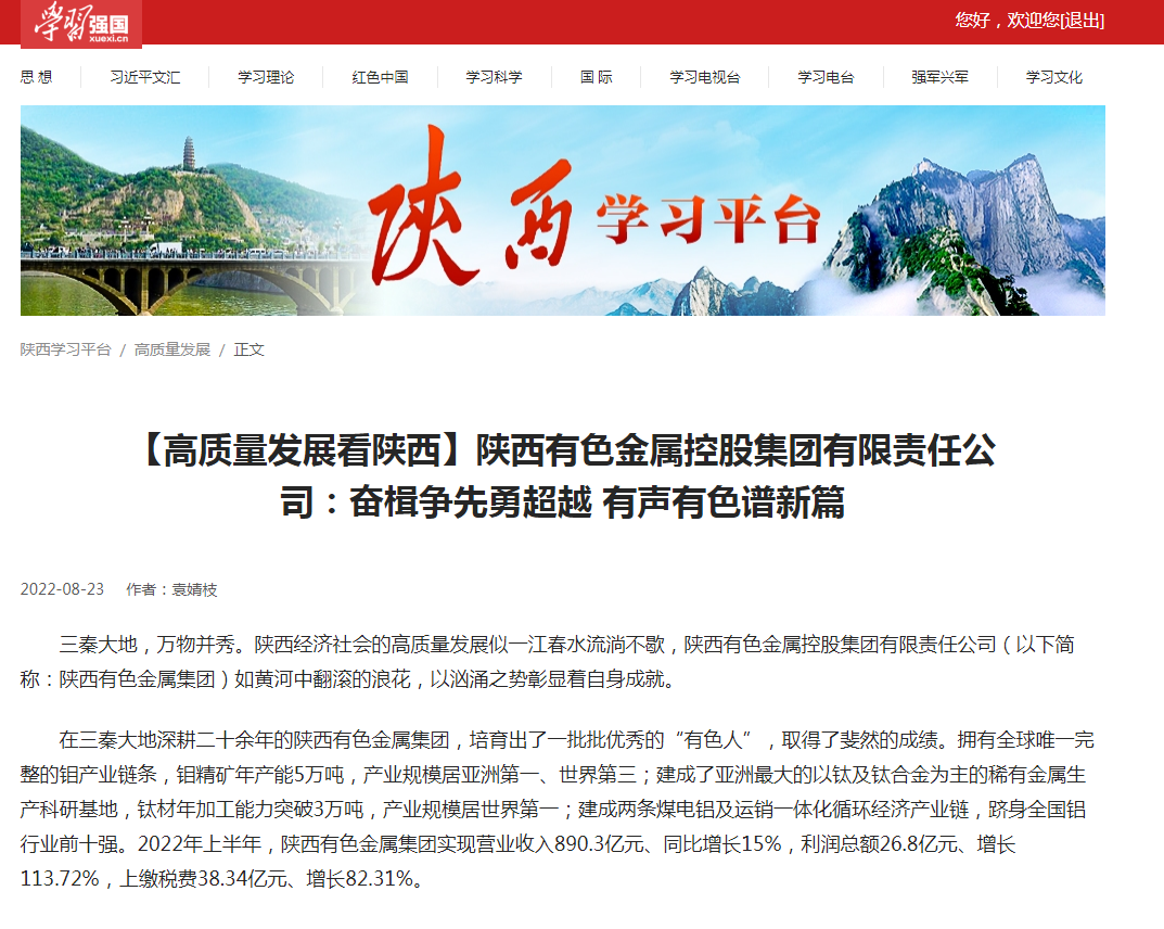 陜西日?qǐng)?bào)、學(xué)習(xí)強(qiáng)國(guó):奮楫爭(zhēng)先勇超越 有聲有色譜新篇——陜西有色金屬控股集團(tuán)有限責(zé)任公司奏響高質(zhì)量發(fā)展更強(qiáng)音