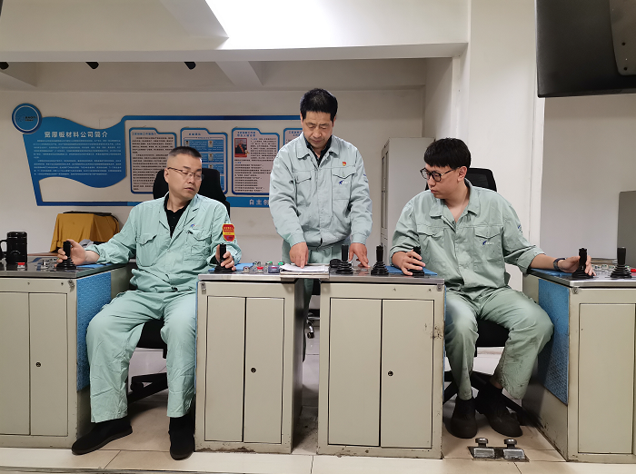 郭文生(中)指導(dǎo)徒弟進行板材軋制。