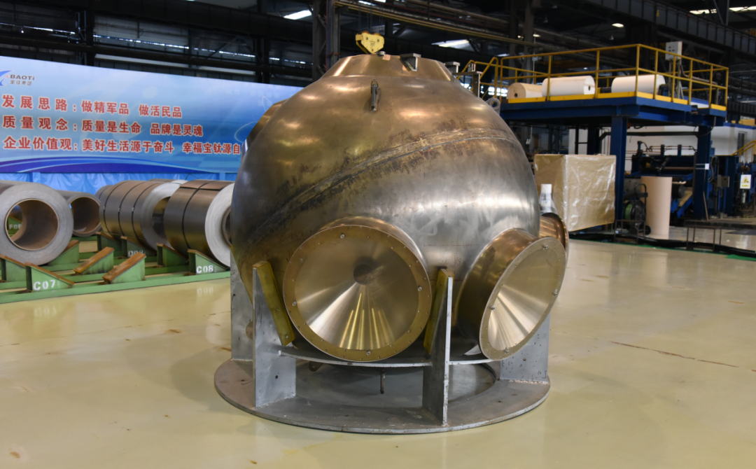 在寶鈦展覽館里,記者見到了這個(gè)銀色的“深潛器載人球殼”,載人球殼由兩個(gè)半球焊接而成,除孔座外,整個(gè)球殼只有一道焊縫,采用半球整體沖壓成型的方案,進(jìn)一步提高了載人球殼的安全可靠性。