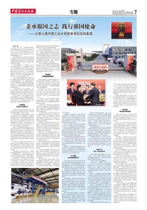 中國有色金屬報(bào):秉承報(bào)國之志 踐行強(qiáng)國使命——記第七屆中國工業(yè)大獎(jiǎng)獲獎(jiǎng)單位寶鈦集團(tuán)
