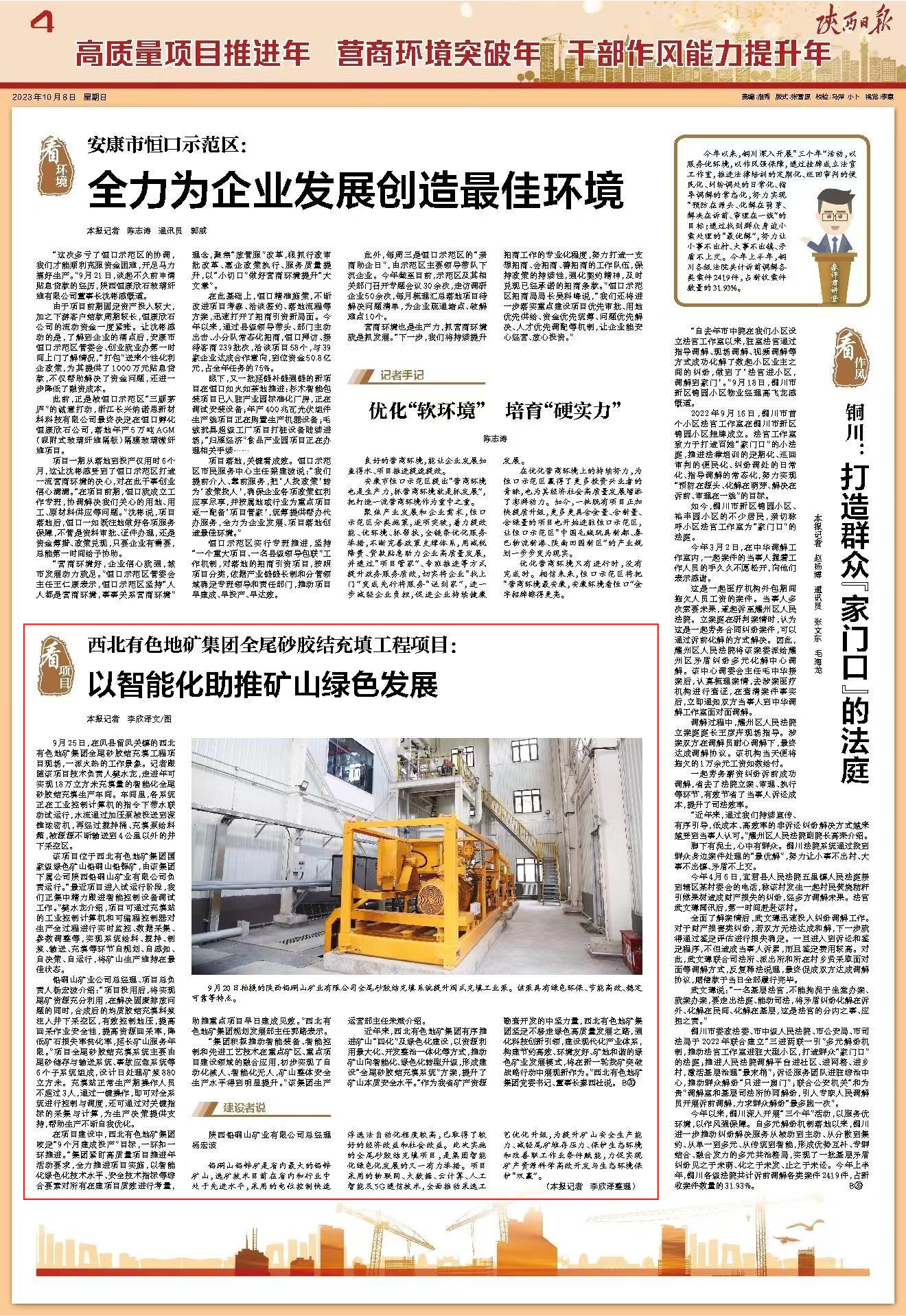陜西日報:西北有色地礦集團(tuán)全尾砂膠結(jié)充填工程項(xiàng)目 以智能化助推礦山綠色發(fā)展
