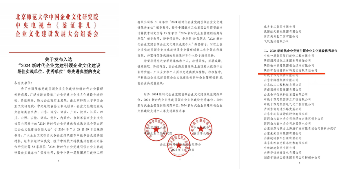 人民周刊網(wǎng)、今日頭條、華商報(bào):榆林新材料獲“2024 新時(shí)代企業(yè)黨建引領(lǐng)企業(yè)文化建設(shè)優(yōu)秀單位”