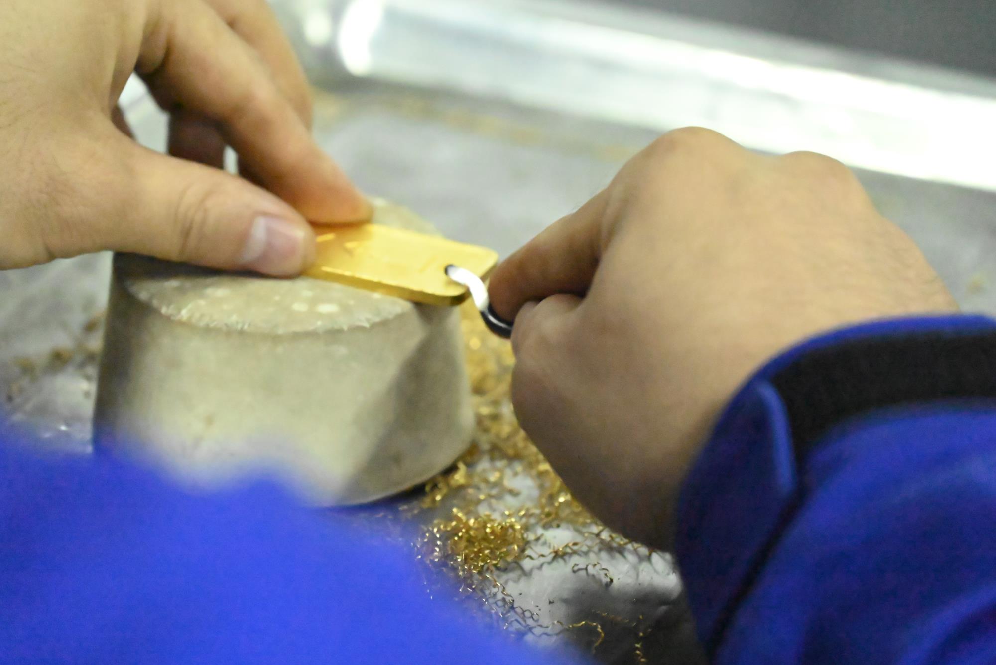 在陜西黃金集團(tuán)西安秦金有限責(zé)任公司(以下簡稱“西安秦金公司”)的貴金屬加工制造車間,工人們正在為鍛造成型的金條壓上“秦金”的標(biāo)志。經(jīng)過鑄毛坯—壓板—落料—找重—退火、沾酸—壓花—修邊找重—拋光—編號—清洗—成品包裝的工序后,一塊標(biāo)準(zhǔn)金條就誕生了。