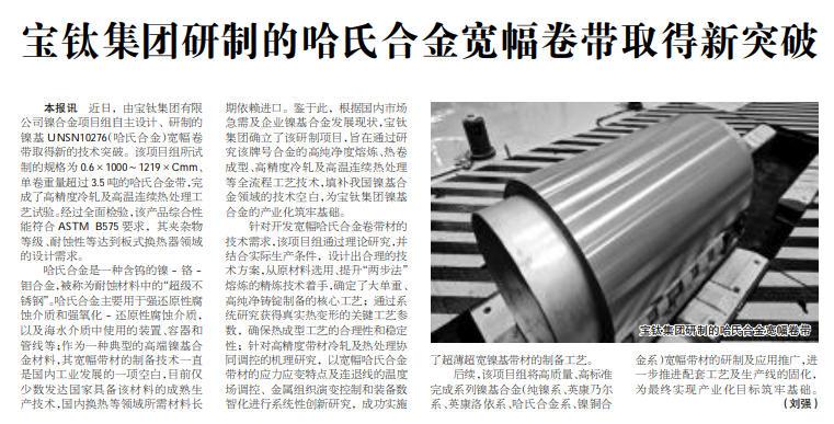 中國(guó)有色金屬報(bào)、有色新聞、搜狐新聞、網(wǎng)易新聞、今日頭條、陜工網(wǎng)、西北在線:寶鈦集團(tuán)鎳合金項(xiàng)目組研制的哈氏合金寬幅卷帶取得新突破