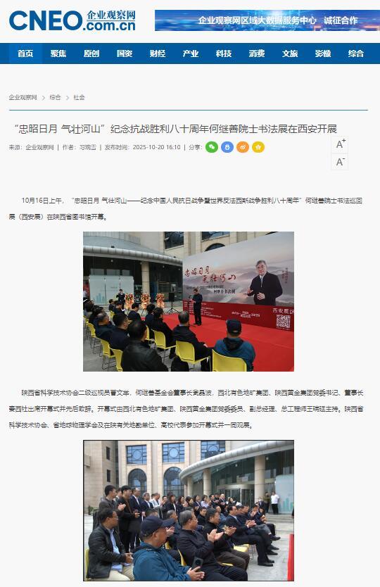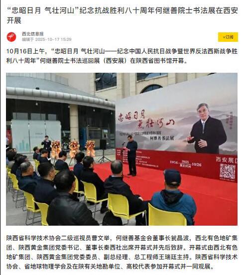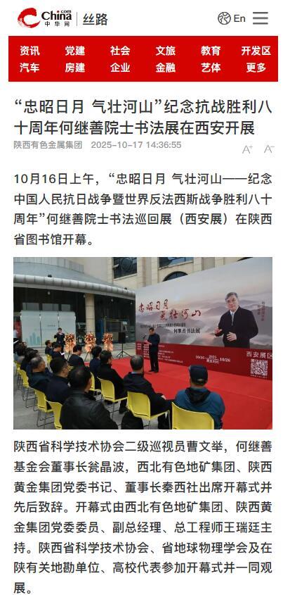 10月16日上午,為紀(jì)念中國(guó)人民抗日戰(zhàn)爭(zhēng)暨世界反法西斯戰(zhàn)爭(zhēng)勝利八十周年,“忠昭日月 氣壯河山——何繼善院士書法展”在陜西省圖書館開幕,地礦集團(tuán)、黃金集團(tuán)進(jìn)行集中報(bào)道,活動(dòng)引發(fā)社會(huì)廣泛關(guān)注與熱烈反響。據(jù)不完全統(tǒng)計(jì),截至目前,活動(dòng)已被中華網(wǎng)、陜西一套、消費(fèi)日?qǐng)?bào)、中國(guó)有色網(wǎng)、起點(diǎn)新聞、絲路建設(shè)、西北信息報(bào)、陜工網(wǎng)、企業(yè)觀察網(wǎng)、搜狐、網(wǎng)易新聞、今日頭條等媒體轉(zhuǎn)載與刊播,形成了多維度、立體化的傳播聲勢(shì)。
