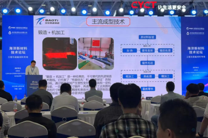 展會期間,寶鈦股份營銷部門與寶鈦研究院專家團隊緊密配合,為來自全球的海洋裝備制造商及科研機構(gòu)提供從技術(shù)咨詢到商務洽談的一站式專業(yè)服務。在“海洋新材料技術(shù)論壇——工程與裝備材料專場”上,裝備制造公司趙彤作專題技術(shù)報告,分享了寶鈦在高端裝備材料應用方面的最新研究成果。