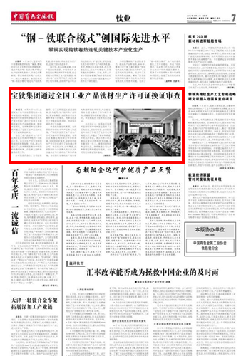 8月5日~6日,由國家生產(chǎn)許可認證管理機構(gòu)4名專家組成的審查組,分別對寶鈦集團和寶鈦股份所涉及的有關(guān)生產(chǎn)單位和部門進行了為期2天的現(xiàn)場審查和產(chǎn)品抽樣檢測。根據(jù)審查情況,寶鈦集團和寶鈦股份順利通過了全國工業(yè)產(chǎn)品鈦材生產(chǎn)許可證的換證審查。