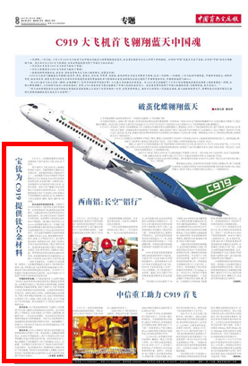 鈦合金材料首選供應(yīng)商。中國商飛對C919商用大飛機用鈦合金材料或部件,采用世界商用飛機通用的全球采購模式。在確定國內(nèi)鈦合金材料首選供應(yīng)商的過程中,商飛將目光投向了有著多年合作經(jīng)驗,世界第四大鈦及鈦合金材料生產(chǎn)制造商、國內(nèi)最大的鈦材加工企業(yè)——寶鈦集團有限公司。中國商飛選擇寶鈦集團最主要的原因是寶鈦集團不僅是我國最早致力于鈦合金材料研究的單位,而且是國內(nèi)掌握鈦合金材料制備關(guān)鍵技術(shù)的龍頭企業(yè),擁有雄厚的科研、技術(shù)、裝備、人才等綜合實力。還與國內(nèi)著名高校、科研院所合作,承擔(dān)了我國眾多鈦合金材料研制及工程應(yīng)用研究項目,是國際著名航空航天器生產(chǎn)制造企業(yè)波音、空客、斯奈克瑪、古德里奇、龐巴迪、羅羅等的鈦材料合格供應(yīng)商和合作伙伴。寶鈦集團秉承合作共贏的理念,從國產(chǎn)大型客機C919項目立項開始,就一直給予高度關(guān)注。中國商飛與寶鈦集團一拍即合,寶鈦集團籌建成立商用大飛機用鈦項目領(lǐng)導(dǎo)小組,并積極與商飛及其零部件制造商通力合作,滿足商飛供應(yīng)商管理和適航認(rèn)證要求,為C919大飛機提供了性能優(yōu)異的鈦合金材料,成為中國商飛大飛機國產(chǎn)化鈦合金材料的首選供應(yīng)商。