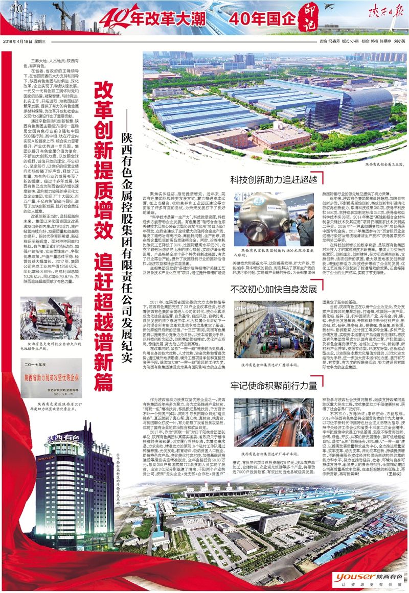 在省委、省政府的正確領(lǐng)導(dǎo)下,在省國(guó)資委的大力支持和指導(dǎo)下,陜西有色集團(tuán)與時(shí)俱進(jìn)、深化改革,企業(yè)實(shí)現(xiàn)了持續(xù)快速發(fā)展。一代又一代有色職工滿懷對(duì)黨和國(guó)家的熱愛(ài),凝聚智慧、與時(shí)俱進(jìn)、扎實(shí)工作、開(kāi)拓進(jìn)取,為我國(guó)經(jīng)濟(jì)繁榮發(fā)展,提供了有力的有色金屬原材料保障,為改革開(kāi)放和社會(huì)主義現(xiàn)代化建設(shè)作出了重要貢獻(xiàn)。
