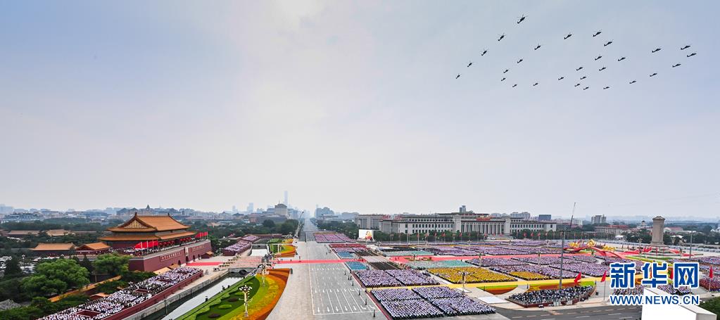 雄鷹翱翔,振翅長空。7時(shí)55分許,中國人民解放軍71架戰(zhàn)機(jī)飛向天安門廣場,向黨致敬,向祖國致敬,向人民致敬。空中護(hù)旗梯隊(duì)拉開飛行慶祝表演序幕,5架直升機(jī)分別懸掛中國共產(chǎn)黨黨旗和寫有“偉大的中國共產(chǎn)黨萬歲”“偉大的中國人民萬歲”“偉大的中華人民共和國萬歲”“全國各族人民大團(tuán)結(jié)萬歲”的條幅迎風(fēng)向前。隨后,直升機(jī)、戰(zhàn)斗機(jī)分別組成“100”“71”字樣掠過長空,15架殲-20飛機(jī)組成3個(gè)梯隊(duì)呼嘯而過,教練機(jī)拉出10道彩煙,精彩的表演激起一陣陣歡呼聲。