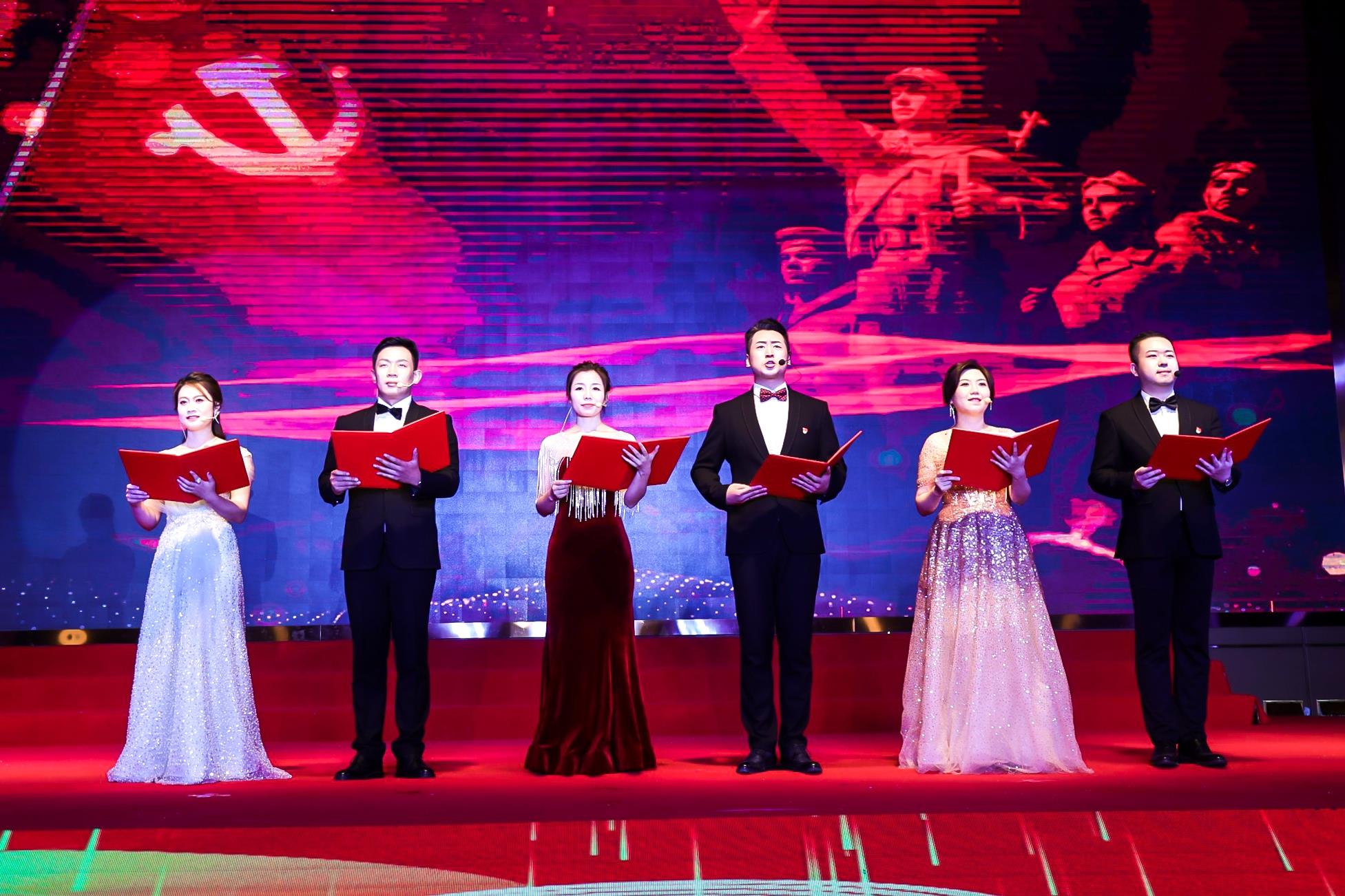 演出現(xiàn)場,燈火輝煌。舞臺中央的LED大屏幕上,金色的黨徽熠熠生輝,中國共產(chǎn)黨成立100周年慶?;顒訕俗R亮麗奪目。紅色背景在璀璨的水晶燈的照射下,給金燦燦的天花板鍍上一層鮮紅,宛如早晨天邊初生的朝霞,充滿希望??犊ぐ旱呐瘓鲆魳?,營造出和諧向上的良好氛圍。