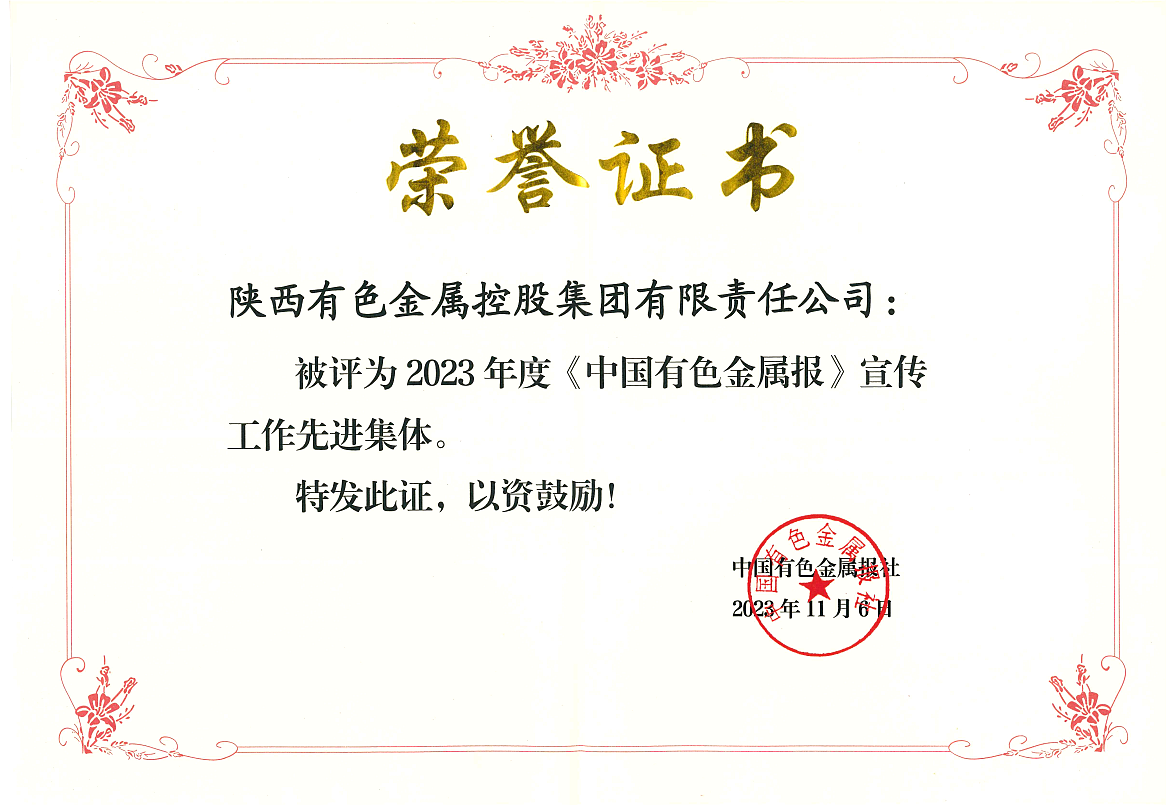 近日,陜西有色金屬集團(tuán)被中國有色金屬報(bào)社評為2023年度宣傳工作先進(jìn)集體。這是在前不久榮獲《中國有色金屬》雜志社宣傳工作先進(jìn)單位之后,該集團(tuán)在宣傳工作方面獲得的又一殊榮。