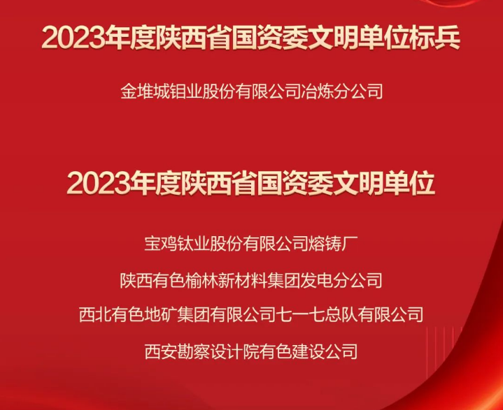 近日,陜西省國資委黨委命名表彰了2023年度陜西省國有企業(yè)文明單位(標(biāo)兵),陜西有色金屬集團5家單位上榜。其中,金堆城鉬業(yè)股份有限公司冶煉分公司榮獲“2023年度陜西省國資委文明單位標(biāo)兵”稱號,寶雞鈦業(yè)股份有限公司熔鑄廠、陜西有色榆林新材料集團發(fā)電分公司榮獲“2023年度陜西省國資委文明單位”稱號,西北有色地礦集團有限公司七一七總隊有限公司、西安勘察設(shè)計院有色建設(shè)公司通過復(fù)審繼續(xù)保留“陜西省國資委文明單位”稱號。