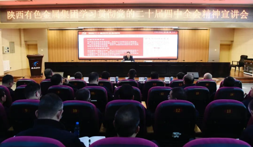 11月25日,陜西有色金屬集團(tuán)黨委副書記、董事、總經(jīng)理莫勇到寶鈦集團(tuán)宣講黨的二十屆四中全會精神并調(diào)研。寶鈦集團(tuán)黨委書記、董事長王儉主持宣講會并陪同調(diào)研。
