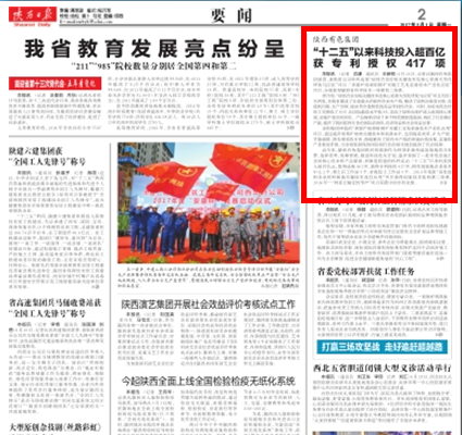 5月1日,中共陜西省委機關(guān)報——《陜西日報》在2版(要聞版)顯要位置以《陜西有色集團“十二五”以來科技投入超百億 獲專利授權(quán)417項》為題,突出報道了集團公司科技創(chuàng)新成果以及“十二五”以來的科技工作成就。據(jù)悉,5月2日,陜西省人民政府國有資產(chǎn)監(jiān)督管理委員會門戶網(wǎng)站《企業(yè)動態(tài)》欄目也以頭條形式對此進行了報道。以下為陜西日報報道全文。