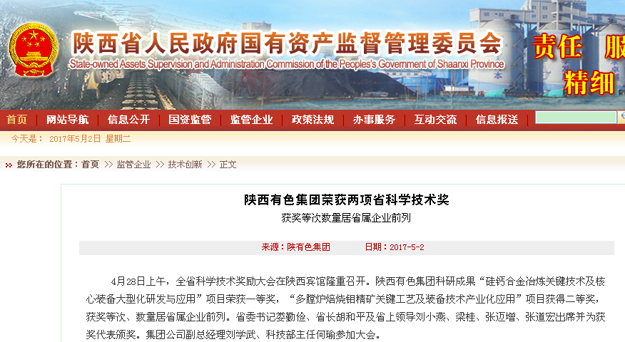 4月28日,記者從陜西有色集團獲悉,該集團公司科研成果“硅鈣合金冶煉關(guān)鍵技術(shù)及核心裝備大型化研發(fā)與應(yīng)用”項目、“多膛爐焙燒鉬精礦關(guān)鍵工藝及裝備技術(shù)產(chǎn)業(yè)化應(yīng)用”項目,分別獲得陜西省科學(xué)技術(shù)一等獎和二等獎。