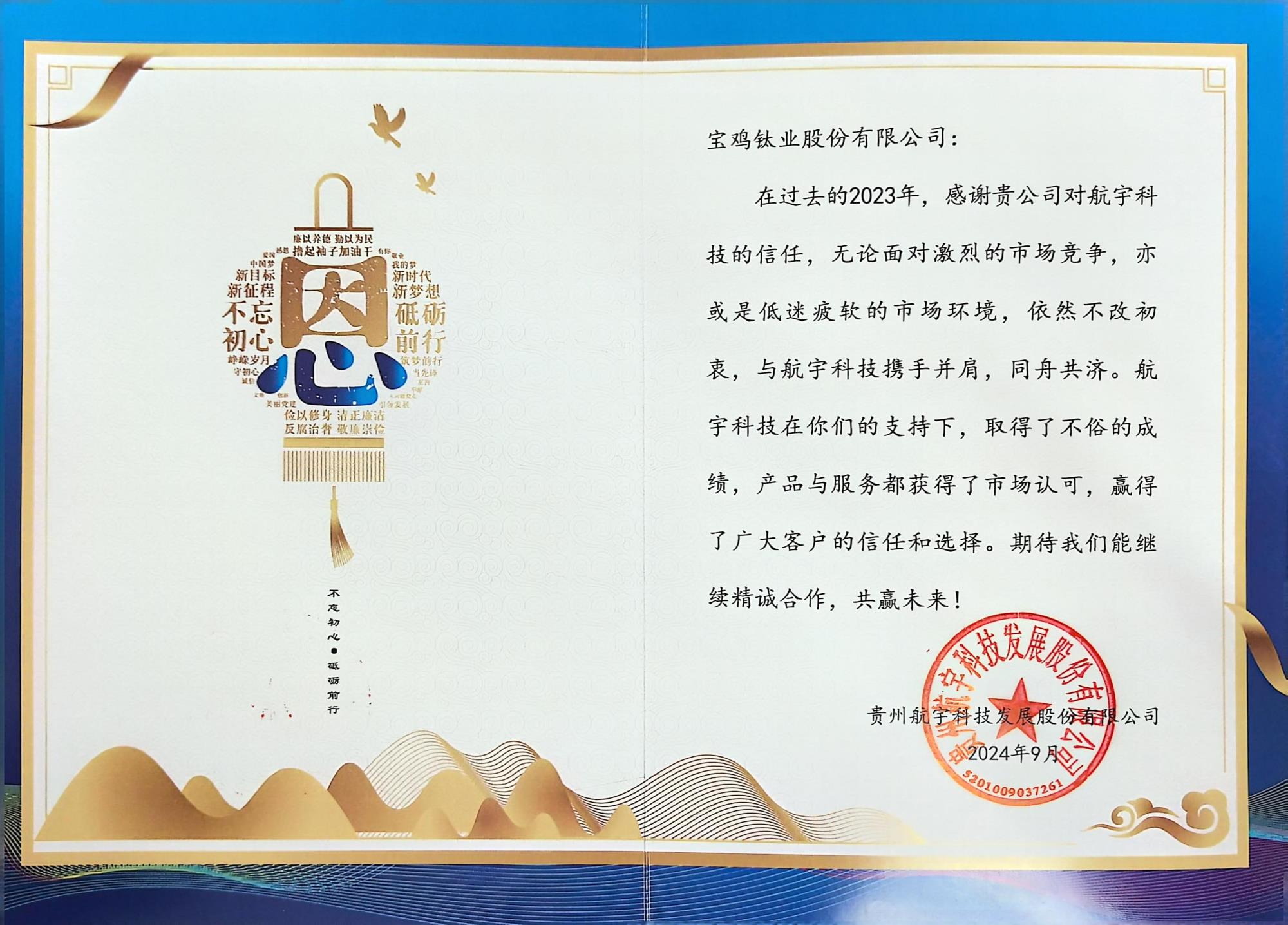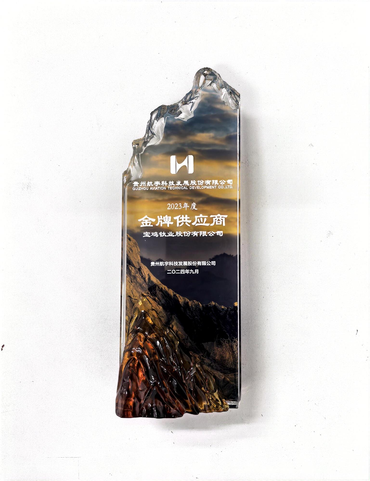 貴州航宇是我國大型航空航天環(huán)鍛件重點(diǎn)生產(chǎn)制造企業(yè),為我國多型航空、航天發(fā)動(dòng)機(jī)進(jìn)行環(huán)鍛件配套生產(chǎn),是寶鈦股份重點(diǎn)核心用戶之一。2023年,面對(duì)激烈的市場(chǎng)競(jìng)爭(zhēng),寶鈦股份在產(chǎn)品技術(shù)質(zhì)量要求不斷提高、交付壓力不斷增大的情況下,克服諸多困難,加強(qiáng)合作交流,保質(zhì)保量完成了交付任務(wù),為貴州航宇順利完成年度計(jì)劃發(fā)揮了至關(guān)重要的作用。近期,貴州航宇根據(jù)其供應(yīng)商管理規(guī)定,從質(zhì)量、交付、服務(wù)等方面對(duì)2023年度供應(yīng)商進(jìn)行績效評(píng)價(jià),寶鈦股份因突出的產(chǎn)品和服務(wù)質(zhì)量,被評(píng)為2023年度“金牌供應(yīng)商”。