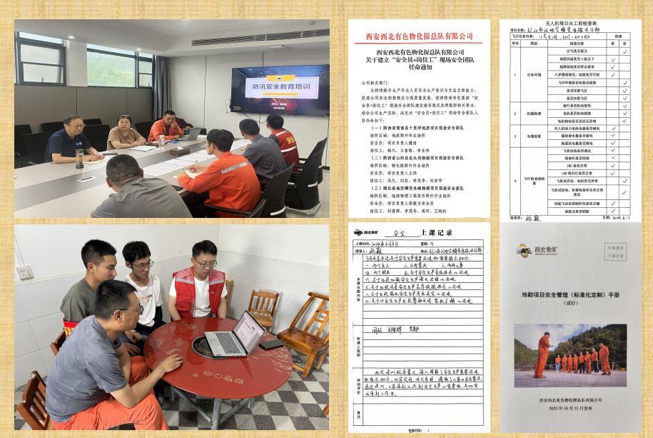 在“湖北省引江補漢地空瞬變電磁物探項目”中,現(xiàn)場安全團隊按照公司“安全員+崗位工”建設方案,結(jié)合《地勘項目安全管理<標準化定制手冊>》《員工安全手冊》等文件要求,堅持以制度規(guī)范管流動項目、以標準流程管現(xiàn)場作業(yè)、以考核評價管人員行為,從項目前培訓、上崗前教育、飛行前交底、收工前總結(jié)等方面,打造了一套“菜單式”安全管理模式。項目部嚴格落實“一崗兩清單”,負責人兼安全員與隊員逐一簽訂責任書,利用“一文件一主題”每日班前會、“袖標+紅馬甲”、“手指口述”等形式,規(guī)范推行安全標準化管理。面對無人機新領(lǐng)域的安全風險,項目部認真學習地勘測繪行業(yè)安全生產(chǎn)指引和無人機風險隱患判定等規(guī)范,聚焦野外踏勘、儀器校驗、測量放線、無人機航測、設備維保等工序,深入開展新場景下的風險辨識、應急演練和隱患排查治理,確保安全風險可控、隱患閉環(huán)管理。