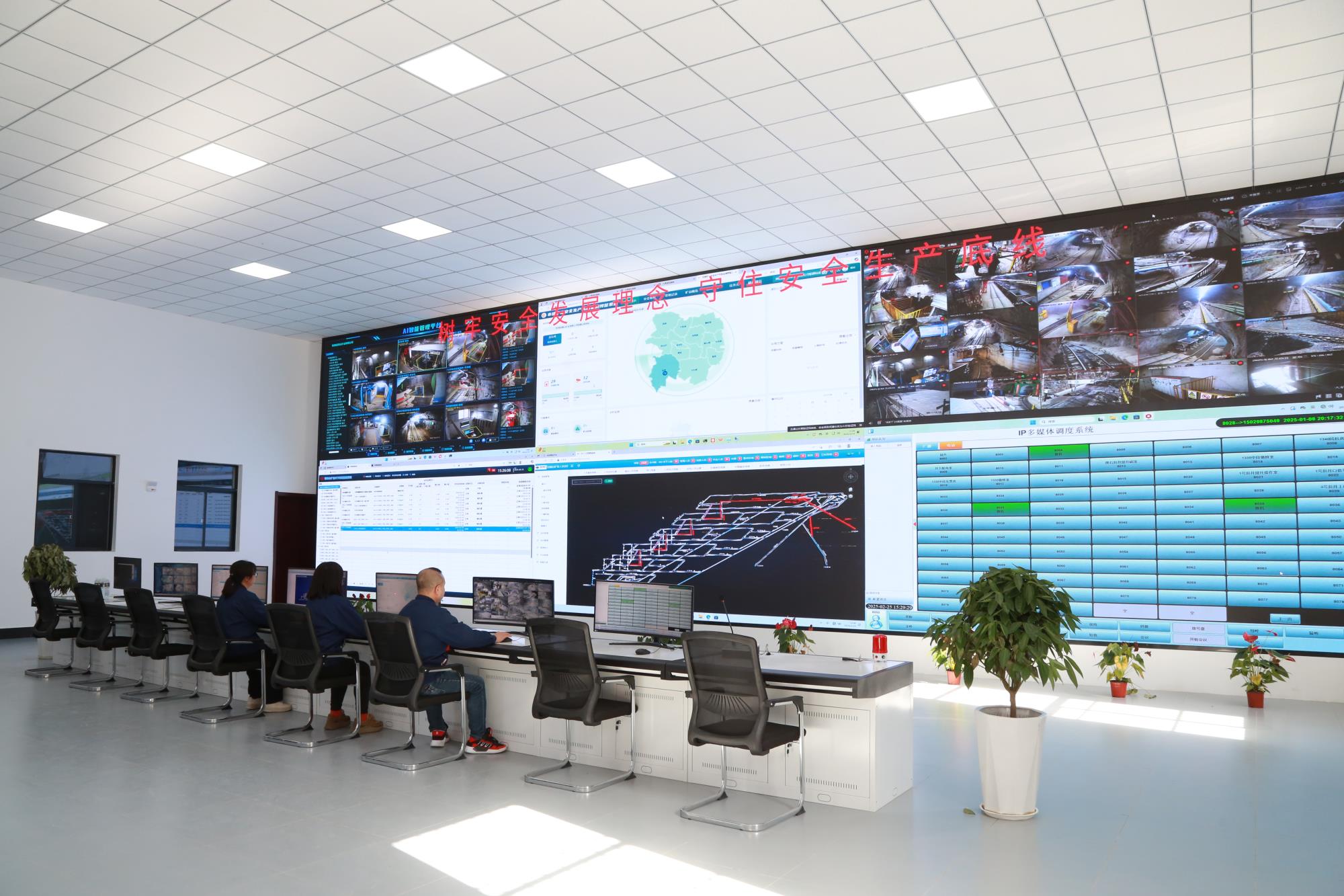 2月19日,在地礦集團(tuán)權(quán)屬鉛鋅集團(tuán)鉛硐山礦業(yè)公司調(diào)度指揮中心,工作人員點(diǎn)擊鼠標(biāo)便可實(shí)現(xiàn)井上井下視頻通話,水泵、風(fēng)機(jī)等停送電控制。這里是礦山調(diào)度的“智慧大腦”,井下的每一個(gè)關(guān)鍵作業(yè)畫面都清晰地反映在監(jiān)控大屏上。