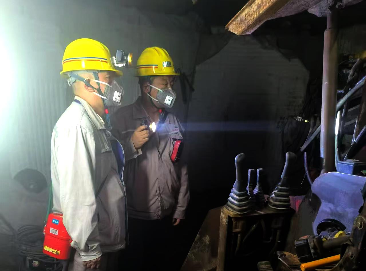 王鑫(右)正在對井下設(shè)備進(jìn)行安全檢查