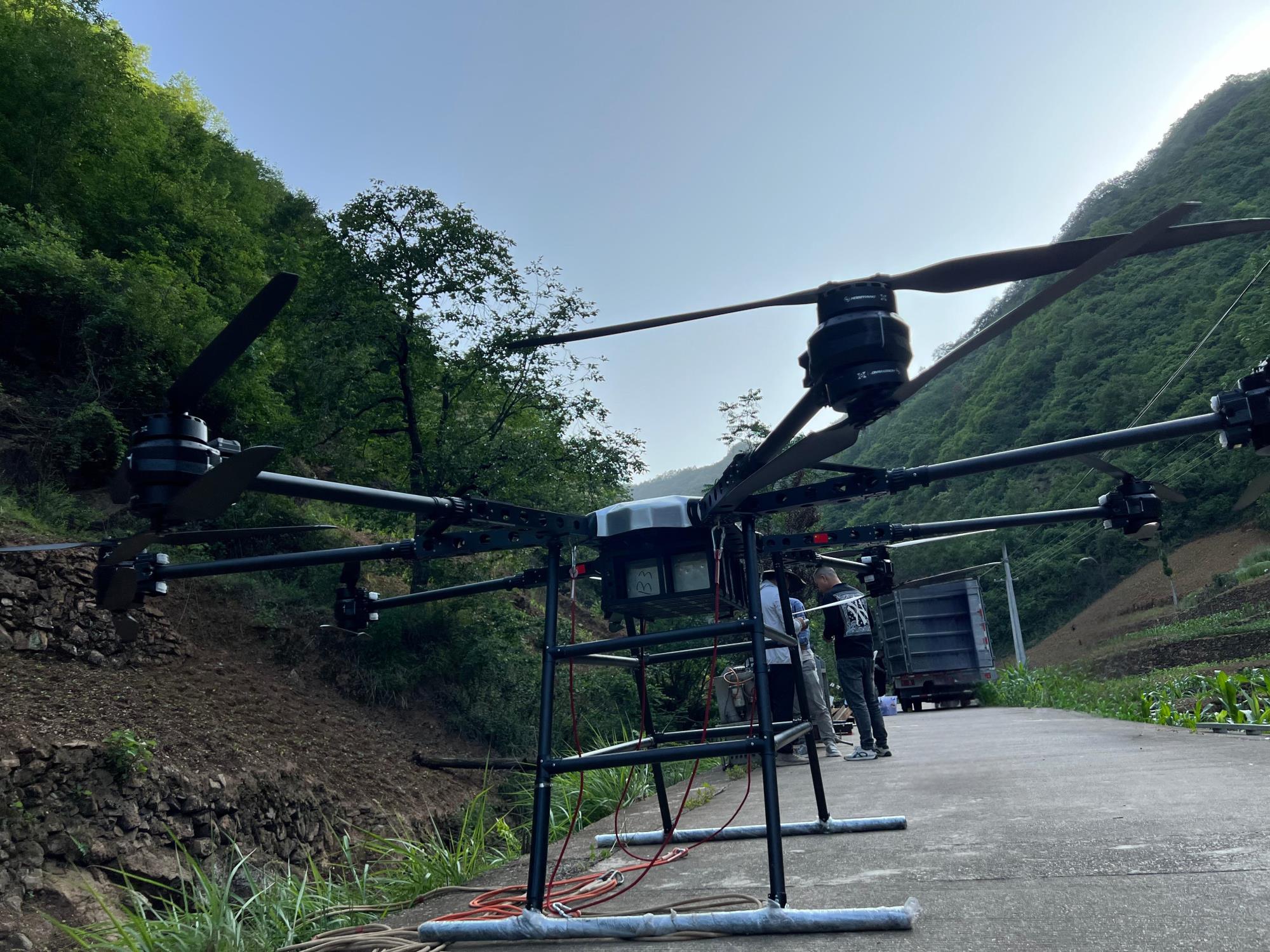 近日,在地礦集團712總隊公司承擔的“陜西省柞水縣板窩槽一帶鈷鎳金多金屬礦普查項目”施工現(xiàn)場,伴隨著槳翼的陣陣轟鳴,一臺大載重工業(yè)無人機裝載著200公斤的柴油發(fā)動機,從山腳穿越茂密的山林,僅需2分鐘便成功將設備精準送達山頂作業(yè)點。這是712總隊公司在地質巖芯鉆探施工領域首次嘗試采用重載無人機進行設備吊裝作業(yè),顯著提升了山區(qū)勘探施工效率。