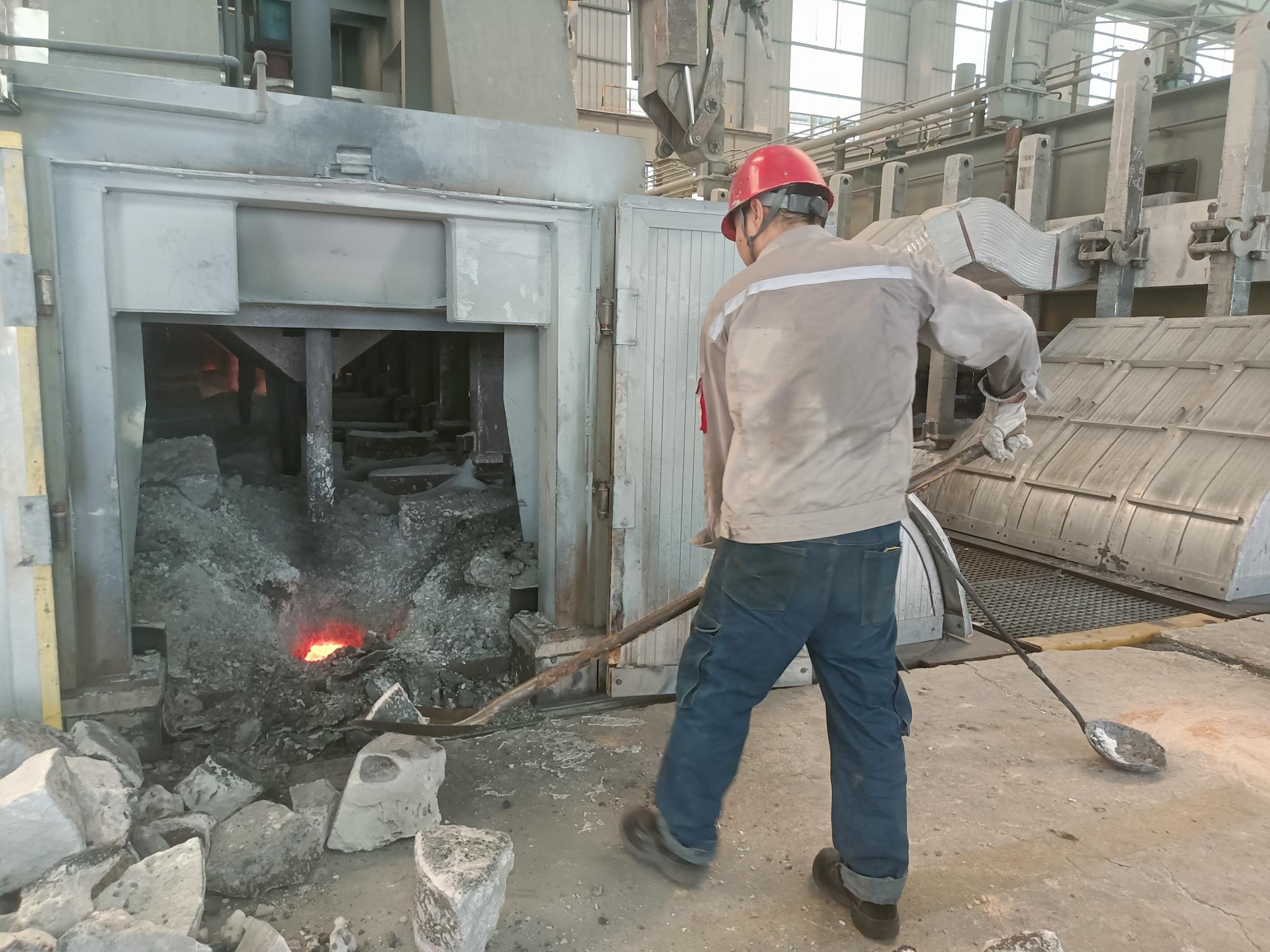 生產(chǎn)現(xiàn)場,500KA電解槽排列成陣,如同一條條沉默的鋼鐵巨龍,槽內(nèi)鋁液翻涌、發(fā)出低沉的嗡鳴。工人們身著厚厚的阻燃工作服、頭戴安全帽,汗水早已浸透衣背,在厚重的工裝上洇開大片深色鹽漬。每一次揮動(dòng)鐵鍬,每一次認(rèn)真巡視,每一次記錄數(shù)據(jù),構(gòu)成一幅與高溫對抗的堅(jiān)韌畫面。