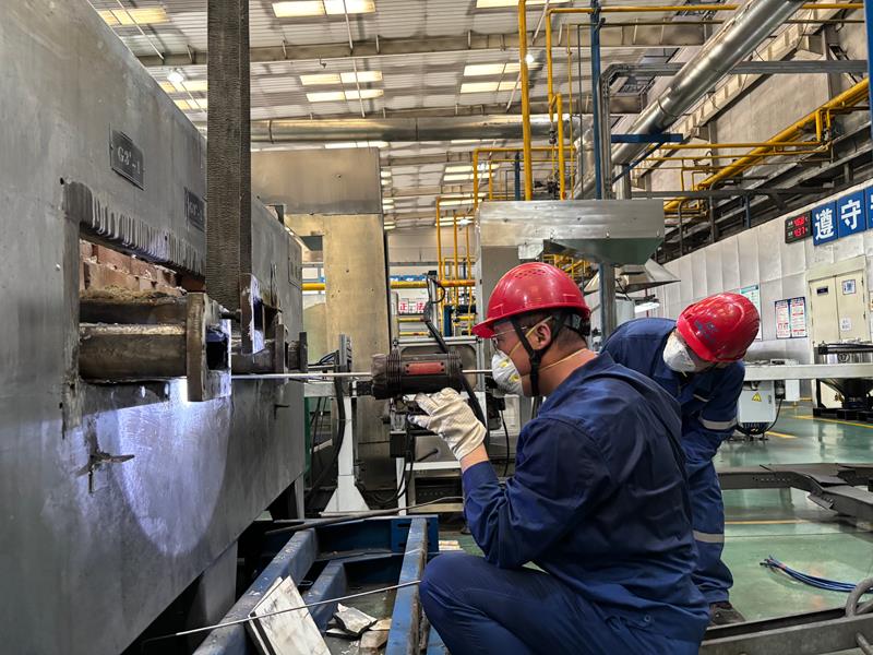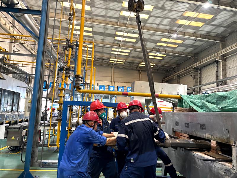 盛夏時(shí)節(jié),驕陽(yáng)似火,車間內(nèi)熱浪翻滾,溫度直超40攝氏度以上。然而,高溫并未阻擋分公司鉬粉分廠員工的戰(zhàn)斗熱情。7月14日,在分廠統(tǒng)籌安排下,一支由黨員干部帶頭、檢修班組與生產(chǎn)骨干組成的突擊隊(duì)迅速集結(jié),制定詳細(xì)的更換方案。全體參戰(zhàn)人員深知,爐管作為高溫爐的核心部件,其狀態(tài)直接關(guān)系到生產(chǎn)效率和產(chǎn)品質(zhì)量,必須爭(zhēng)分奪秒高質(zhì)量完成更換任務(wù)。