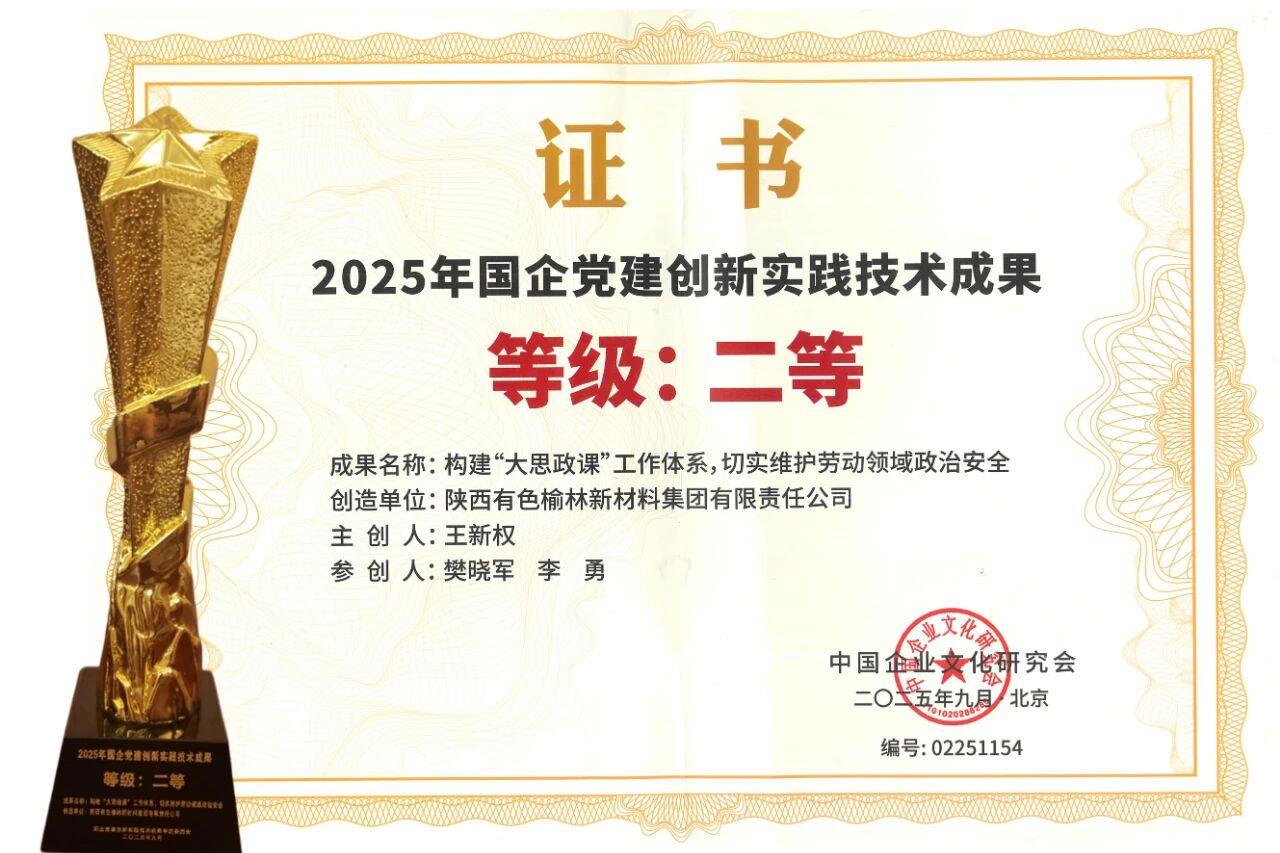 近日,2025年國企黨建創(chuàng)新實(shí)踐交流會在北京召開。會上,公布了“2025年國企黨建創(chuàng)新實(shí)踐技術(shù)成果”評選結(jié)果。榆林新材料集團(tuán)黨委申報(bào)的黨建創(chuàng)新成果《構(gòu)建“大思政課”工作體系,切實(shí)維護(hù)勞動領(lǐng)域政治安全》憑借突出的創(chuàng)建成效,獲評“2025年國企黨建創(chuàng)新實(shí)踐技術(shù)成果”第二等級。