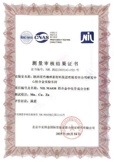 近日,榆林新材料集團研發(fā)中心鋁合金中化學成分分析、鋁合金棒材室溫拉伸測定、粉末粒度分析(激光衍射法)測定三個項目順利通過國家CNAS實驗室測量審核能力驗證,評價結(jié)果均為“滿意”,并獲得能力驗證證書,證明其檢測技術(shù)能力已符合中國合格評定國家認可委員會(CNAS)實驗室認可要求。