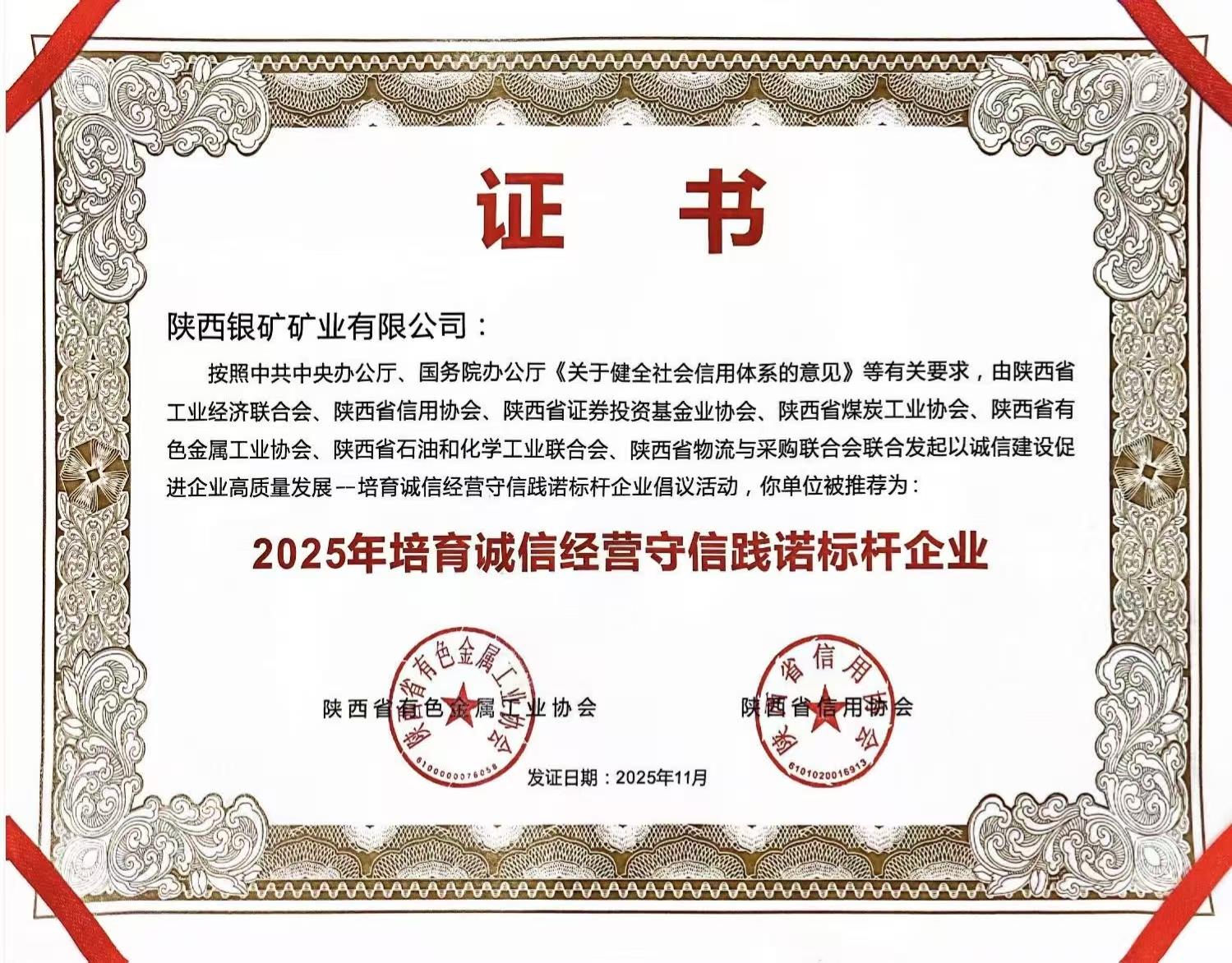 近日,陜西銀礦礦業(yè)有限公司被陜西省有色金屬工業(yè)協(xié)會(huì)與陜西省信用協(xié)會(huì)聯(lián)合評(píng)為“2025年培育誠(chéng)信經(jīng)營(yíng)守信踐諾標(biāo)桿企業(yè)”。這一榮譽(yù)標(biāo)志著陜西銀礦在誠(chéng)信體系建設(shè)領(lǐng)域的成果獲得行業(yè)與信用管理權(quán)威機(jī)構(gòu)的雙重認(rèn)可。