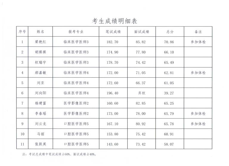 西北有色醫(yī)院2019年省屬事業(yè)單位公開招聘面試環(huán)節(jié)已經(jīng)結(jié)束,依據(jù)《事業(yè)單位人事管理條例》《陜西省事業(yè)單位公開招聘工作人員實施辦法》及2019年陜西省省屬事業(yè)單位公開招聘工作人員公告要求,考試總成績,按照與崗位招聘計劃1:1的比例從高分到低分確定參加體檢人員?,F(xiàn)將有關(guān)事項公告如下: