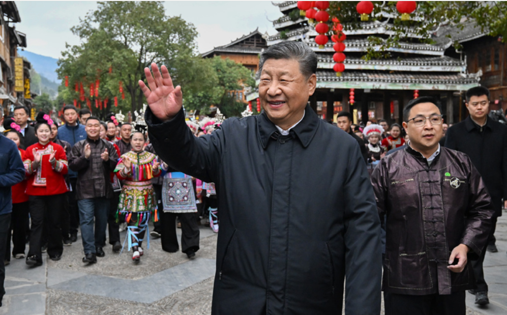 這是17日下午,習(xí)近平在黔東南州黎平縣肇興侗寨考察結(jié)束時(shí),同鄉(xiāng)親們揮手道別。