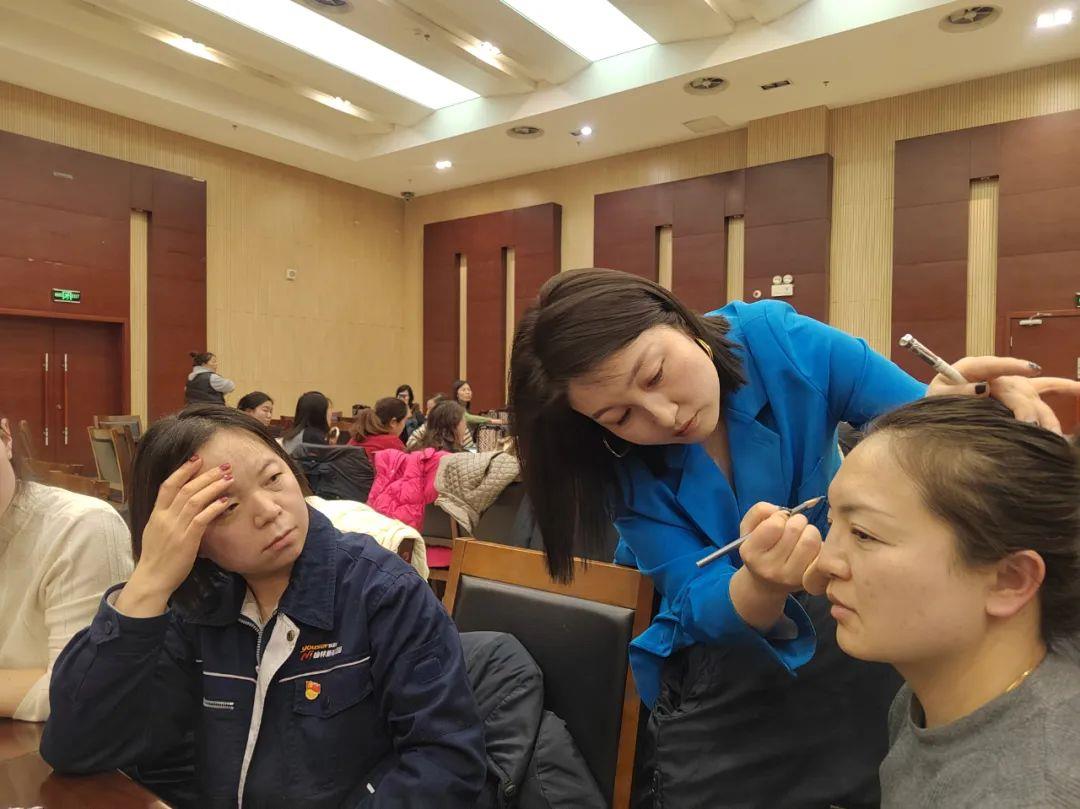實(shí)操伊始,化妝老師挑選了一位女職工充當(dāng)模特進(jìn)行上臺試裝,根據(jù)模特儀容儀表現(xiàn)場教學(xué),并通過互動的方式耐心細(xì)致地對各個(gè)化妝環(huán)節(jié)一一講解。示范完畢后,在一陣陣的驚嘆聲中,大家躍躍欲試,對著鏡子“活學(xué)活用”,在自行化妝或彼此化妝的道路上愈發(fā)明快。期間,化妝老師不停地穿梭在女工們身邊,手把手地教大家化妝的技巧和要領(lǐng),用簡單明了的方法將專業(yè)的化妝知識生活化、具象化,使得女工們快速的了解和掌握了化妝的基本要領(lǐng)?;顒幼詈螅瘖y師貼心安排了修眉環(huán)節(jié),根據(jù)各位女工臉型精心修剪眉形,為女工送去最美的祝福。