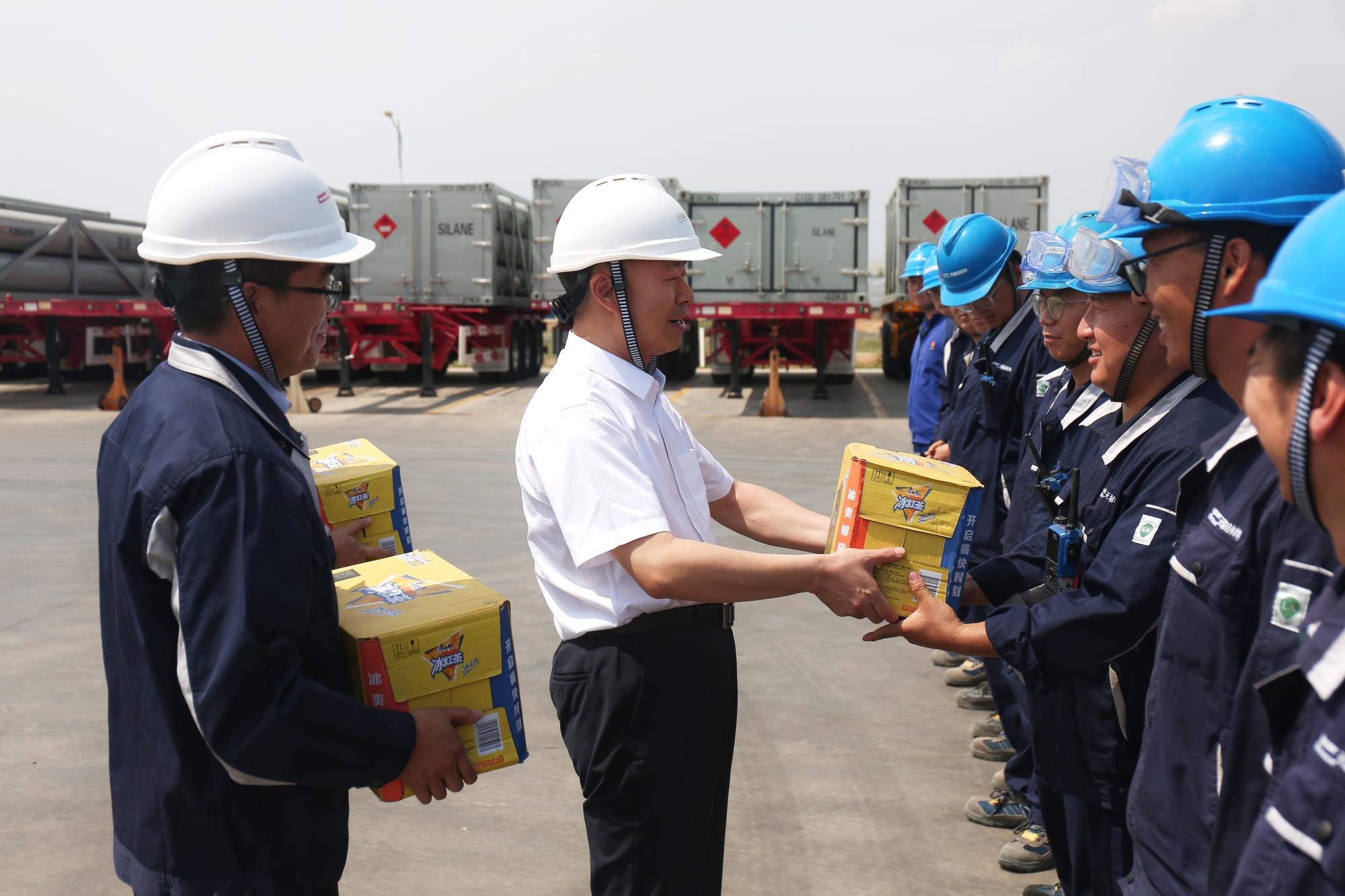 炎炎夏日送清涼,絲絲關(guān)愛沁人心,黃忠良一行深入到生產(chǎn)現(xiàn)場,為廣大一線職工送去冰紅茶、蘇打水、加多寶等防暑降溫物品,并代表集團公司黨委、工會向不畏酷暑、堅守崗位的一線職工致以崇高的敬意和親切的問候。