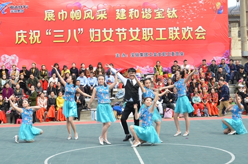鈦城春意鬧,桃花灼灼開(kāi)。3月7日下午,寶鈦集團(tuán)老區(qū)燈光球場(chǎng)上又回蕩起了動(dòng)人的歌聲、歡快的音樂(lè),來(lái)自寶鈦各基層分會(huì)的500余名女職工歡聚一堂,以自編自導(dǎo)自演的大聯(lián)歡形式共同慶祝第107個(gè)“國(guó)際勞動(dòng)?jì)D女節(jié)”的到來(lái)。公司工會(huì)主席、紀(jì)委書(shū)記白林讓?zhuān)笨偨?jīng)理丁忠杰,公司職工文化體育活動(dòng)領(lǐng)導(dǎo)小組成員、各分會(huì)主席觀看表演。