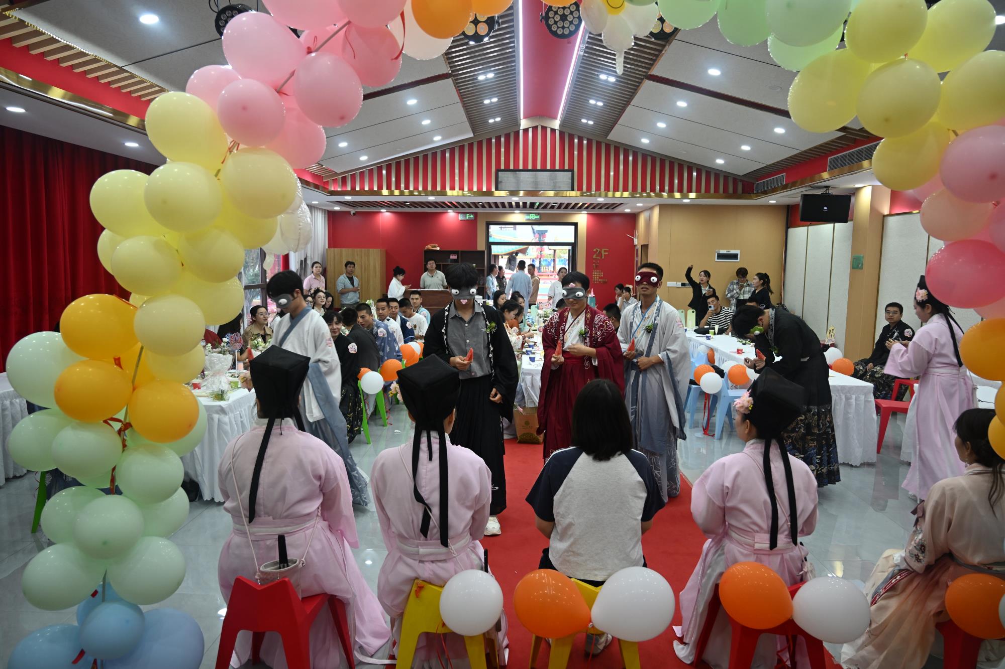 活動(dòng)伊始,身著典雅漢服的青年男女在花月薈主入口簽到,領(lǐng)取專屬胸針與手環(huán),于古韻氛圍中沉浸式感受傳統(tǒng)文化魅力。在隨后的游園定向挑戰(zhàn)環(huán)節(jié),男女嘉賓在繽紛花海中合影留念,協(xié)力完成“終極考官”設(shè)定的趣味任務(wù);高潮迭起的“喜從天降拋繡球”點(diǎn)燃全場(chǎng)熱情,成功搶得繡球的嘉賓組成“繡球CP”;在小劇場(chǎng)二樓,“愛情實(shí)驗(yàn)室”趣味游戲輪番上演,“桃花朵朵開”“蒙眼遞西瓜”……現(xiàn)場(chǎng)氣氛溫馨融洽。在主持人的鼓勵(lì)下,多位嘉賓勇敢表達(dá)心意,最終公司5名單身青年成功牽手,收獲全場(chǎng)熱烈掌聲與美好祝福。