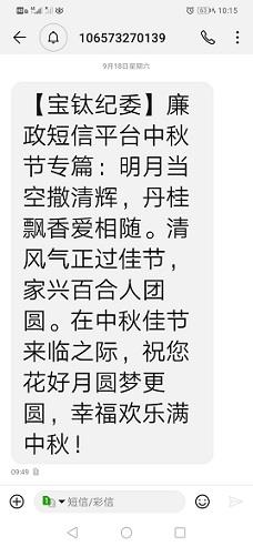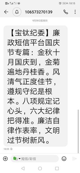 寶鈦集團(tuán)紀(jì)委利用寶鈦啟明星微信公眾號、寶鈦OA協(xié)同網(wǎng)等新媒體平臺,轉(zhuǎn)載中央紀(jì)委國家監(jiān)委在中秋、國慶節(jié)前通報(bào)曝光的違反中央八項(xiàng)規(guī)定精神典型案例,在利用反面典型開展警示教育的同時(shí),一改往日說教式短信的文風(fēng),結(jié)合中秋、國慶的節(jié)日特點(diǎn),自編原創(chuàng)以廉潔過節(jié)為主題的“打油詩”。9月18日,以“明月當(dāng)空灑清輝,丹桂飄香愛相隨。清風(fēng)氣正過佳節(jié),家興百合人團(tuán)圓。在中秋佳節(jié)來臨之際,祝您花好月圓夢更圓,幸福歡樂滿中秋”為內(nèi)容;9月30日,以“金秋十月國慶到,金菊遍地丹桂香。風(fēng)清氣正度佳節(jié),遵規(guī)守紀(jì)是根本。八項(xiàng)規(guī)定記心頭,六大紀(jì)律把得準(zhǔn)。廉潔自律作表率,文明過節(jié)樹新風(fēng)”為內(nèi)容,通過寶鈦廉政短信平臺向公司全體中層及以上干部發(fā)送節(jié)前提醒短信2條、共450人次。