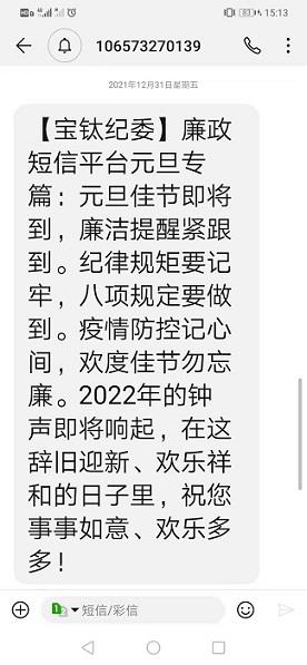 節(jié)前,寶鈦集團紀委在寶鈦啟明星微信公眾號、寶鈦OA協(xié)同網(wǎng)廉政教育專欄刊載中央紀委國家監(jiān)委公開通報十起違反中央八項規(guī)定精神典型問題和陜西省紀委監(jiān)委公開通報五起違反中央八項規(guī)定精神典型問題;通過廉政短信平臺,元旦前夕向公司所有中層及以上干部發(fā)送廉政短信1條,共計225人次,要求公司廣大黨員領(lǐng)導(dǎo)干部要落實好廉潔過節(jié)的各項紀律要求,筑牢思想防線,努力營造風清氣正的過節(jié)氛圍。