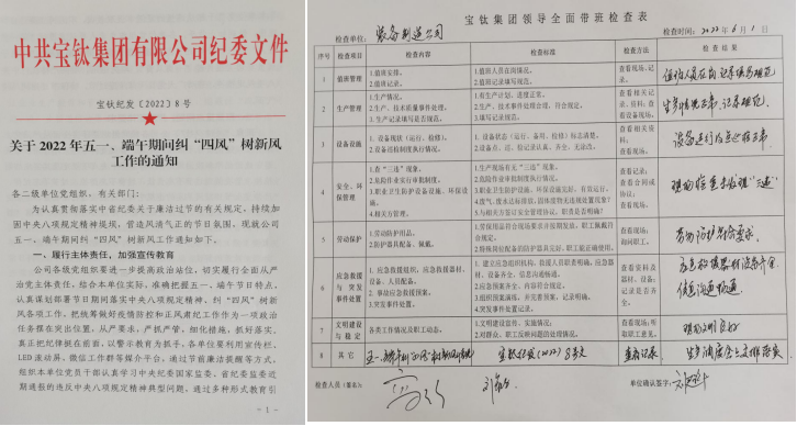 為貫徹落實好陜西有色金屬集團紀委關(guān)于五一、端午期間糾“四風(fēng)”樹新風(fēng)的相關(guān)要求,寶鈦集團紀委在前期認真安排部署、廉潔提醒教育、聚焦突出問題、嚴明紀律要求,強化責(zé)任落實的基礎(chǔ)上,端午節(jié)來臨前專門安排紀檢干部,利用值班檢查之機,不打招呼不提醒,對寶鈦集團裝備制造公司、板材廠和鍛造廠3家二級單位黨總支落實五一、端午期間正風(fēng)肅紀工作情況,進行督導(dǎo)抽查。