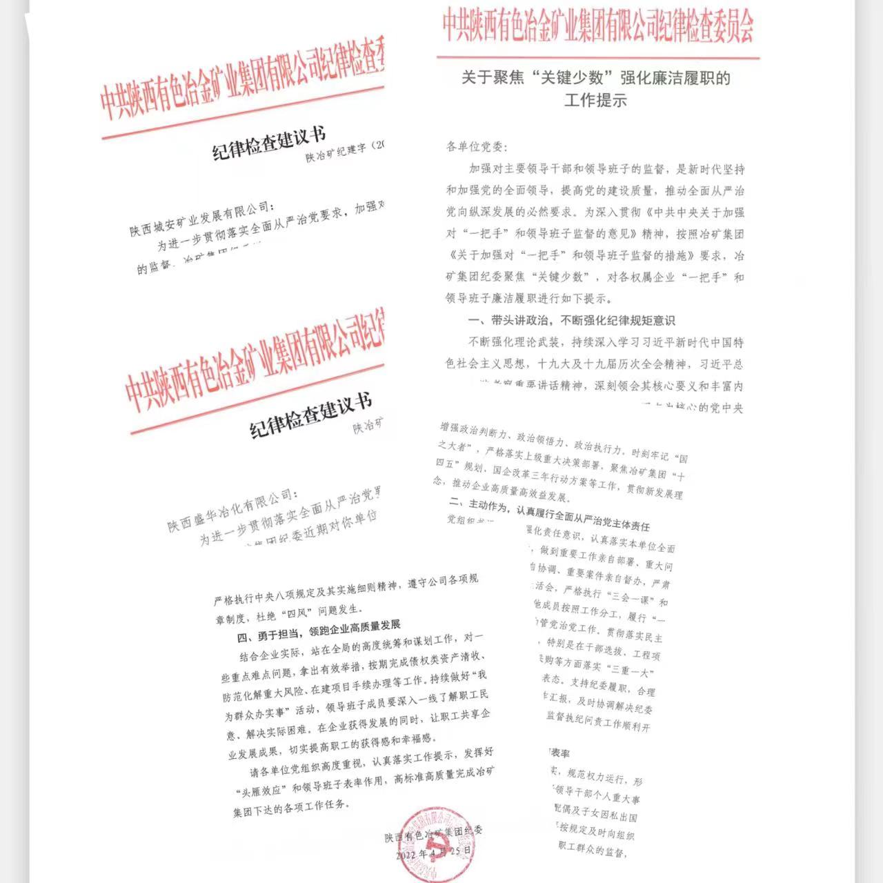2022年是陜西有色金屬集團“高質量項目建設年”,冶礦集團及各權屬單位共涉及6個建設項目,其中實施類項目3個,儲備類項目2個,研發(fā)類項目1個。為確保項目建設取得實效,冶礦集團紀委靠前監(jiān)督,聚焦主責主業(yè),下發(fā)了《關于聚焦“關鍵少數(shù)” 強化廉潔履職的工作提示》,督促各權屬單位“一把手”及領導班子遵紀守法、嚴于律己,筑起項目建設廉潔“防火墻”。
