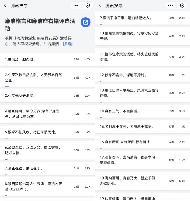 為了深入推進(jìn)“清廉有色”建設(shè),推動(dòng)“清風(fēng)潤煤業(yè)·廉潔促發(fā)展”系列活動(dòng)扎實(shí)開展并取得實(shí)效,近日,榆林新材料煤業(yè)公司紀(jì)委組織開展廉潔格言和廉潔座右銘征集活動(dòng),并采取線上投票的方式對(duì)報(bào)送的36條優(yōu)秀格言進(jìn)行評(píng)選,最終評(píng)選出心底無私天地寬,利欲熏心路難行”、心無私欲自然會(huì)剛,人無邪念自然公正”兩條優(yōu)秀廉潔格言。這一活動(dòng)不僅讓黨員干部承諾踐諾,更讓廣大職工群眾充分參與進(jìn)來,在公司范圍內(nèi)形成人人參與清廉文化建設(shè)、共筑廉潔防線的良好氛圍。
